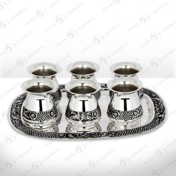 Hand embossed Indian architecture inspired oxidised finish tray and wine shaped glass set of 6. (pieces=1+6)