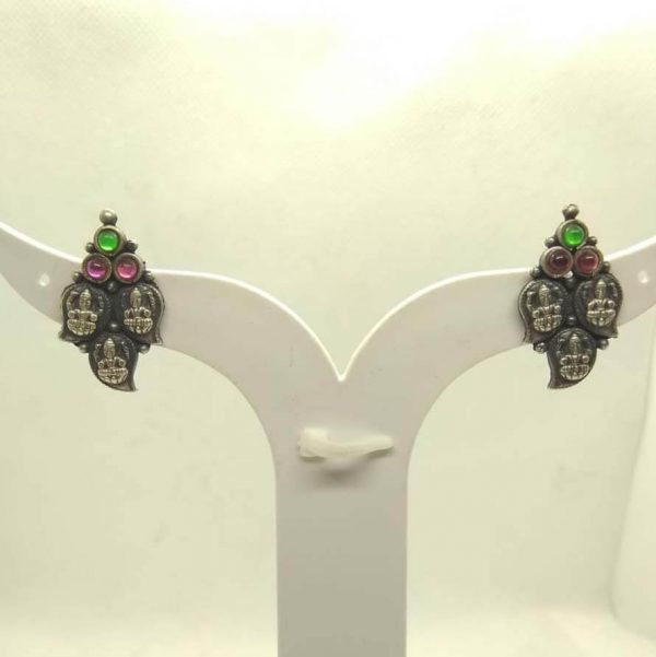 These silver earrings inspired by Indian mythology. Each piece is exclusive in pattern and embedded with red and green stones.