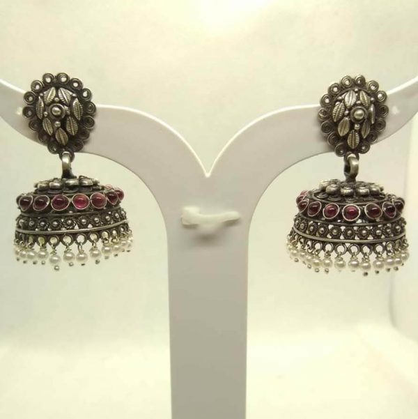 These silver earrings inspired by Indian motifs. Each piece is exclusive in pattern and embedded with red stones, attached white beads