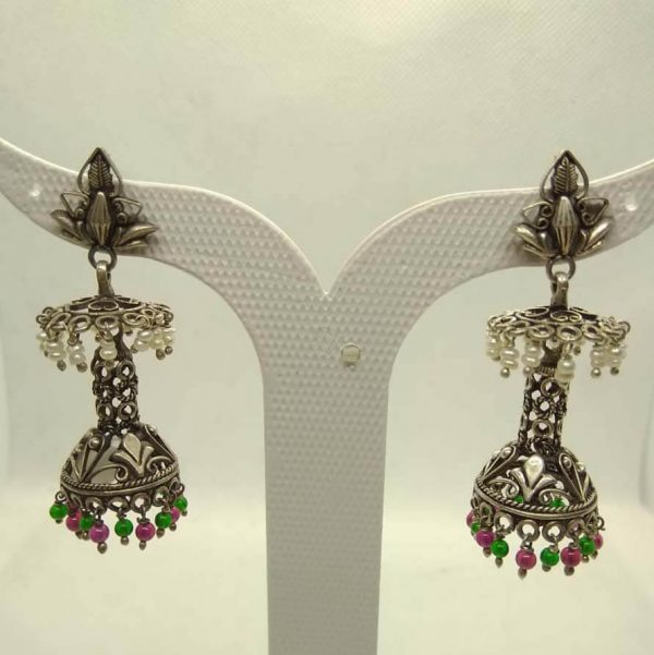 These silver earrings are inspired by Indian motifs. Each piece is exclusive in the pattern and embedded with red stones, attached with pink and green beads.