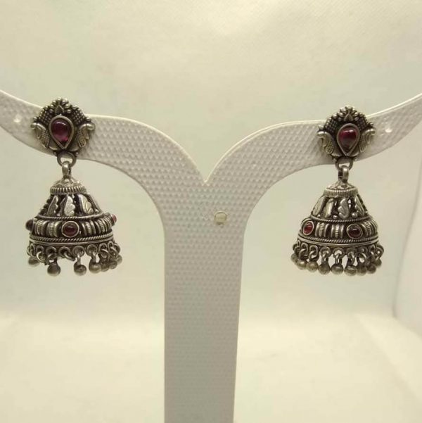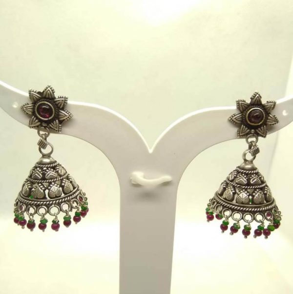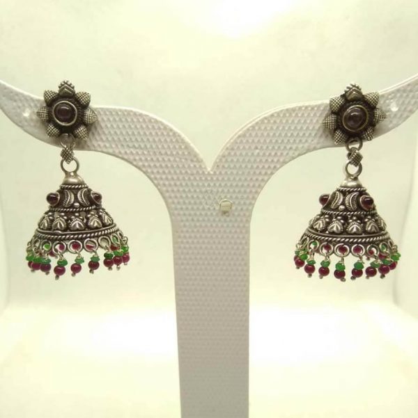 These silver earrings inspired by Indian motifs. Each piece is exclusive in pattern and embedded with red and green beads