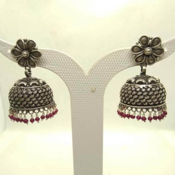 These silver earrings are inspired by Indian motifs. Each piece is exclusive in the pattern and embedded with red stones, attached with red and white beads.