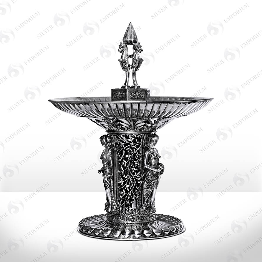 This masterpiece is inspired by Romanian theme. The stand of the bowl is of Romanian women to beautify and enhance the piece. Every inch of the product is crafted and typically taken from the Romanian art, which make it a charming piece. At the top there are two lions placed to give a Royal look to the piece, its base is crafted beautifully which gives a look of several lion’s paw.