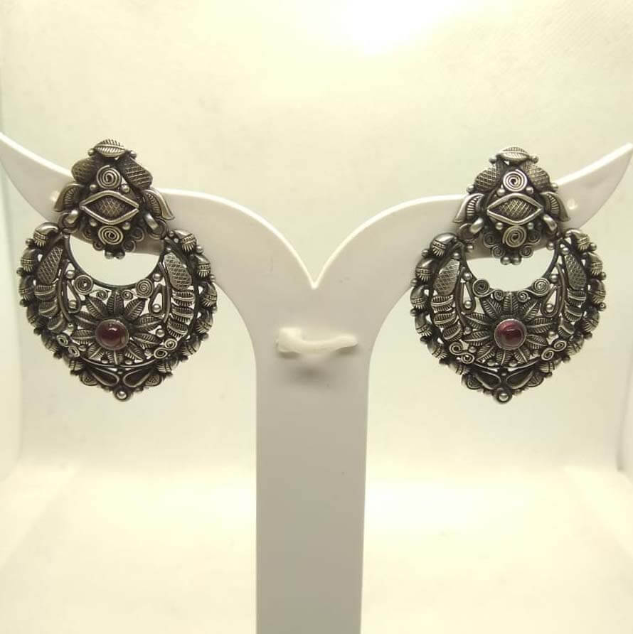 These silver earrings inspired by Indian motifs. Each piece is exclusive in pattern and embedded with red stones.