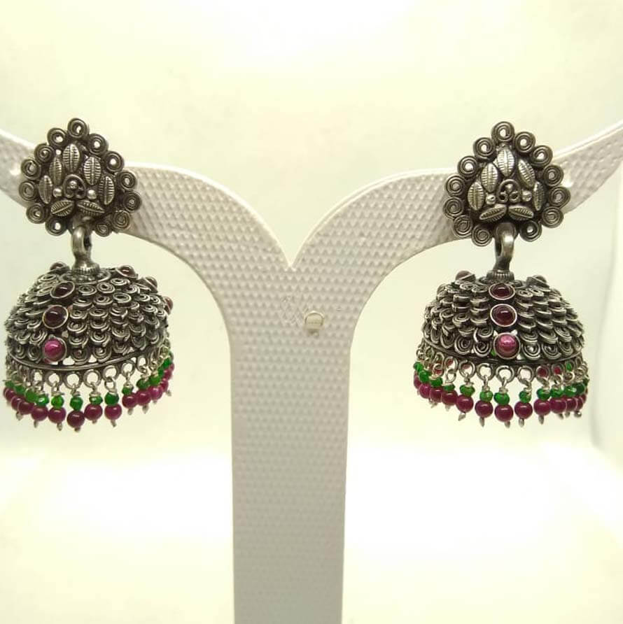 These silver earrings inspired by Indian motifs. Each piece is exclusive in pattern and embedded with red stones, attached red and green beads