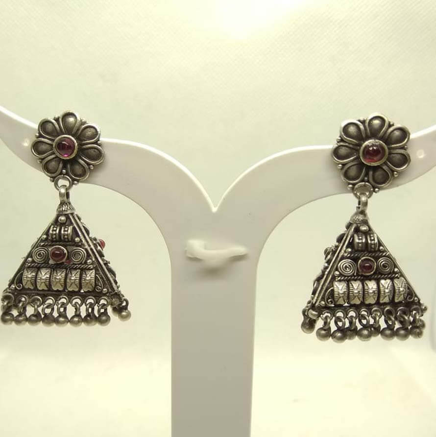 These silver earrings inspired by Indian motifs. Each piece is stylish, exclusive in pattern and embedded with red stones.