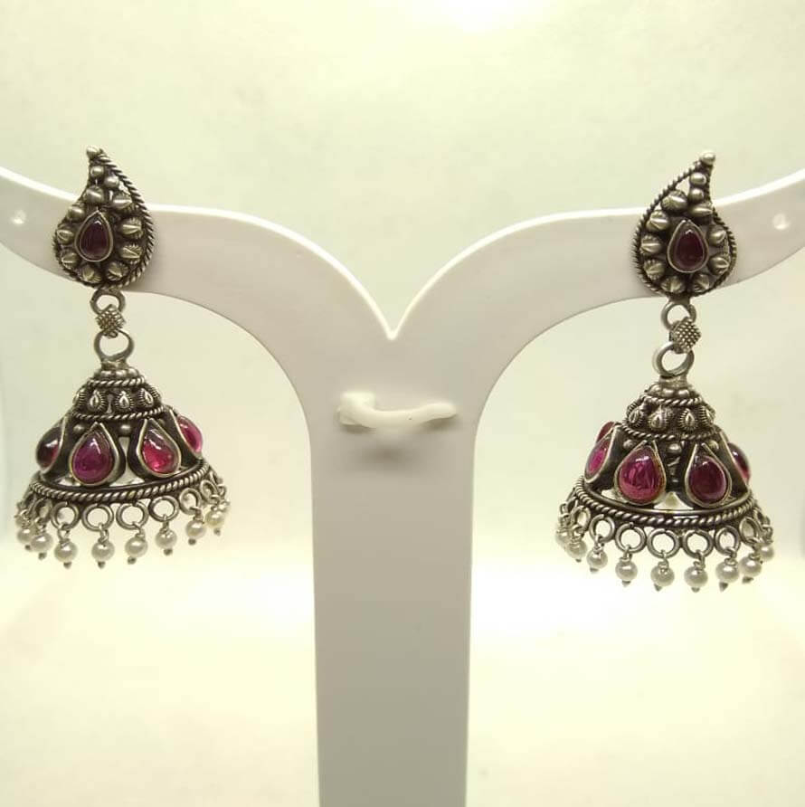 These silver earrings inspired by Indian motifs. Each piece is stylish, exclusive in a pattern, embedded with red stones.