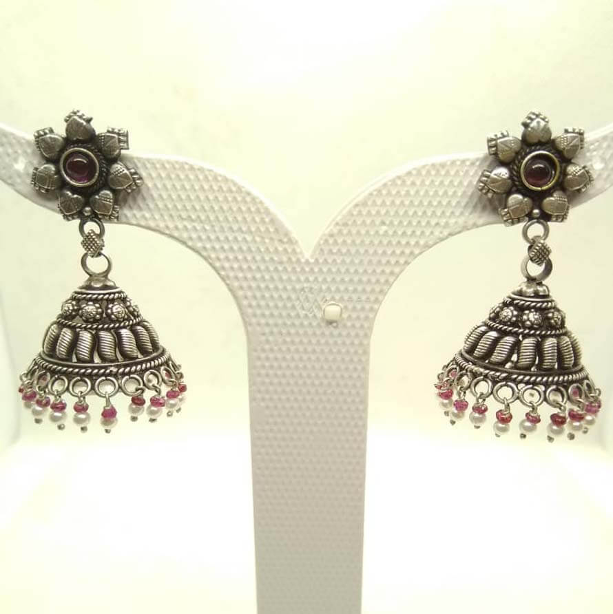These silver earrings inspired by Indian motifs. Each piece is stylish, exclusive in pattern and embedded with red and green stones and beads.