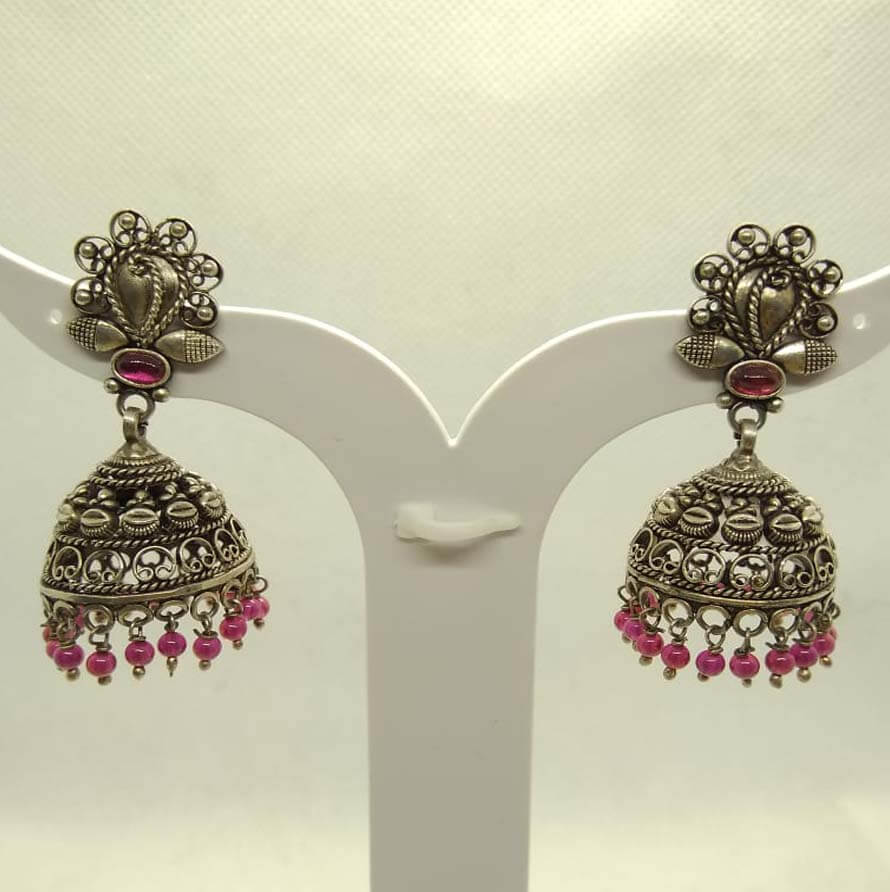 These silver earrings are inspired by Indian motifs. Each piece is exclusive in the pattern and embedded with red stones, attached with pink beads.