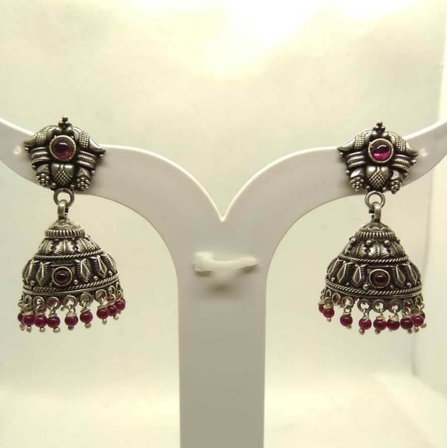 These silver earrings inspired by Indian motifs. Each piece is stylish, exclusive in pattern and embedded with red and green stones.