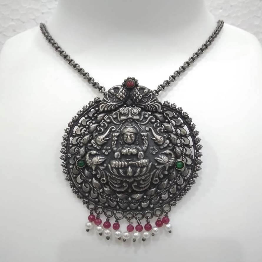 The silver temple pendant is inspired by Goddess Laxmi, each piece is attached with intricacy. Embedded with precious stones and attached with white red beads