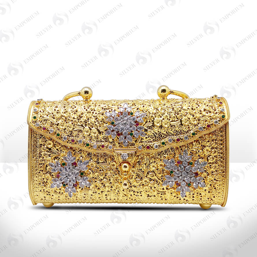 Horal embossed clutch with diamond stone with golden finish base polish.
