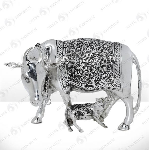 A silver chariot where the Mushakraj plays sarathi while Ganesha enjoys the ride.