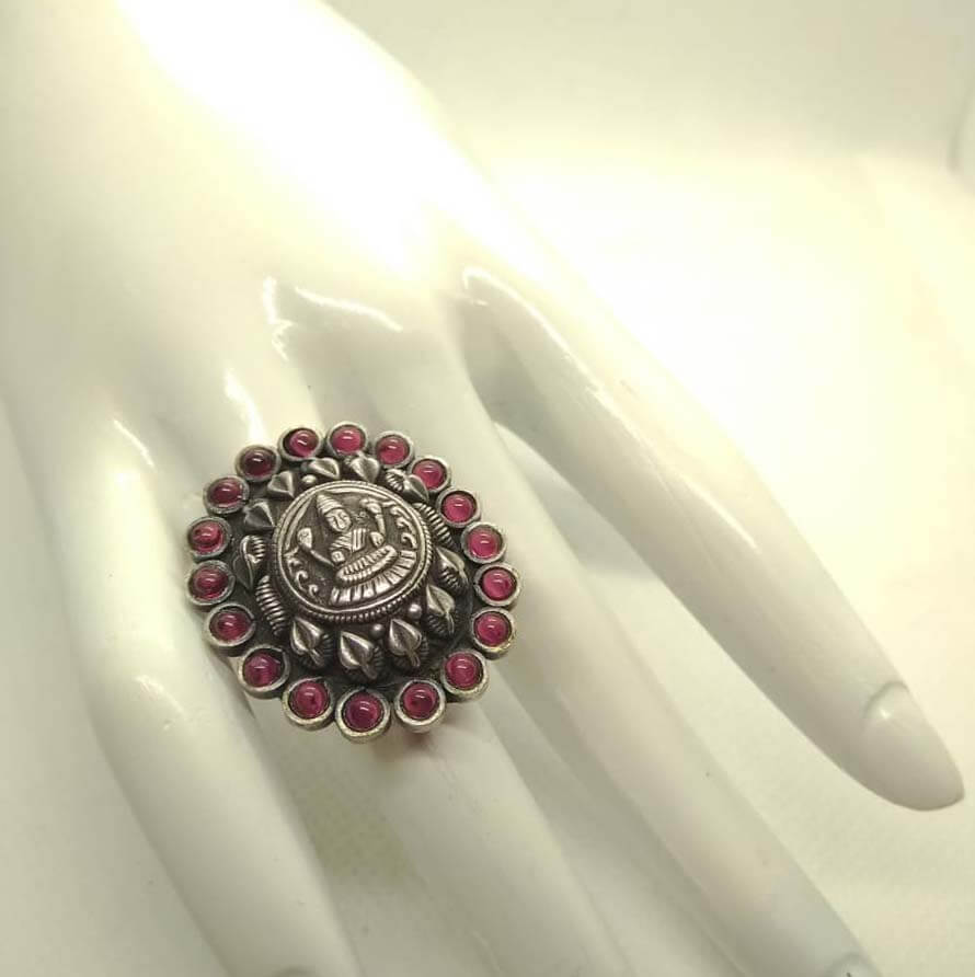 Inspired by Indian mythology this ring is crafted from oxidised silver, studded with Pink precious stone and beautifully presented with intricate work.
