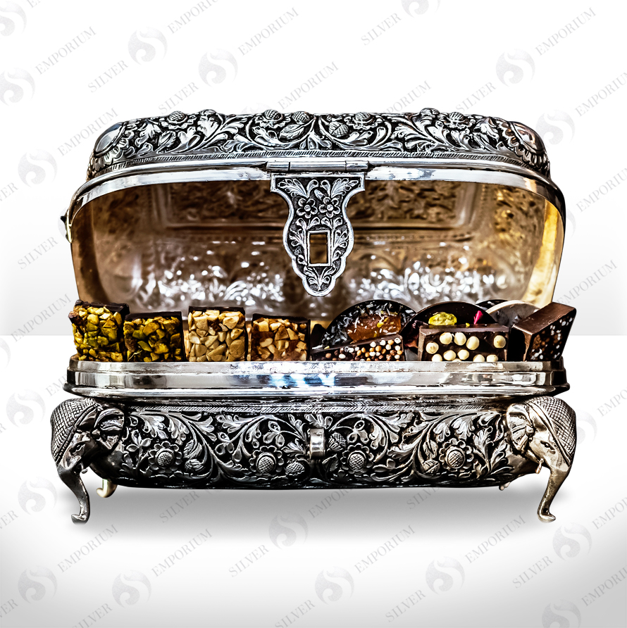 Hand embossed floral motif with embedded outstone on top with 4 casted elephant trunk.